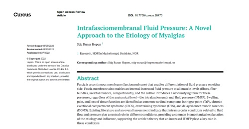 Hopen S (August 27, 2022) Intrafasciomembranal Fluid Pressure: A Novel Approach to the Etiology of Myalgias. Cureus 14(8): e28475. doi:10.7759/cureus.28475