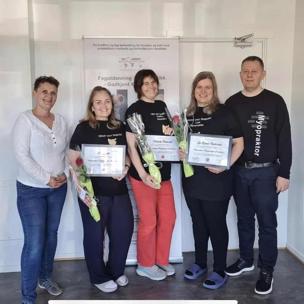 Første kull nyutdannede myopraktorer (2024). Fra venstre: Anne Grete Johnsen (myopraktor og medlærer), Siv R, Langøy, Marielle Fostervoll, Liss Renate Tustervatn og hovedlærer Stig Runar Hopen