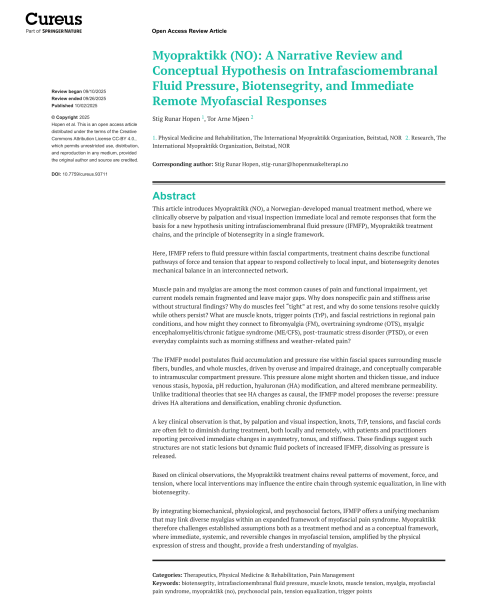 Hopen S, Mjøen T (October 02, 2025) Myopraktikk (NO): A Narrative Review and Conceptual Hypothesis on Intrafasciomembranal Fluid Pressure, Biotensegrity, and Immediate Remote Myofascial Responses. Cureus 17(10): e93711. doi:10.7759/cureus.93711